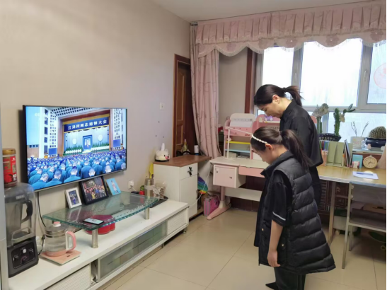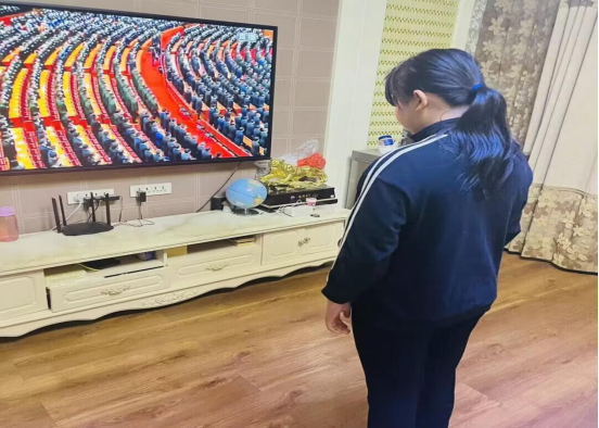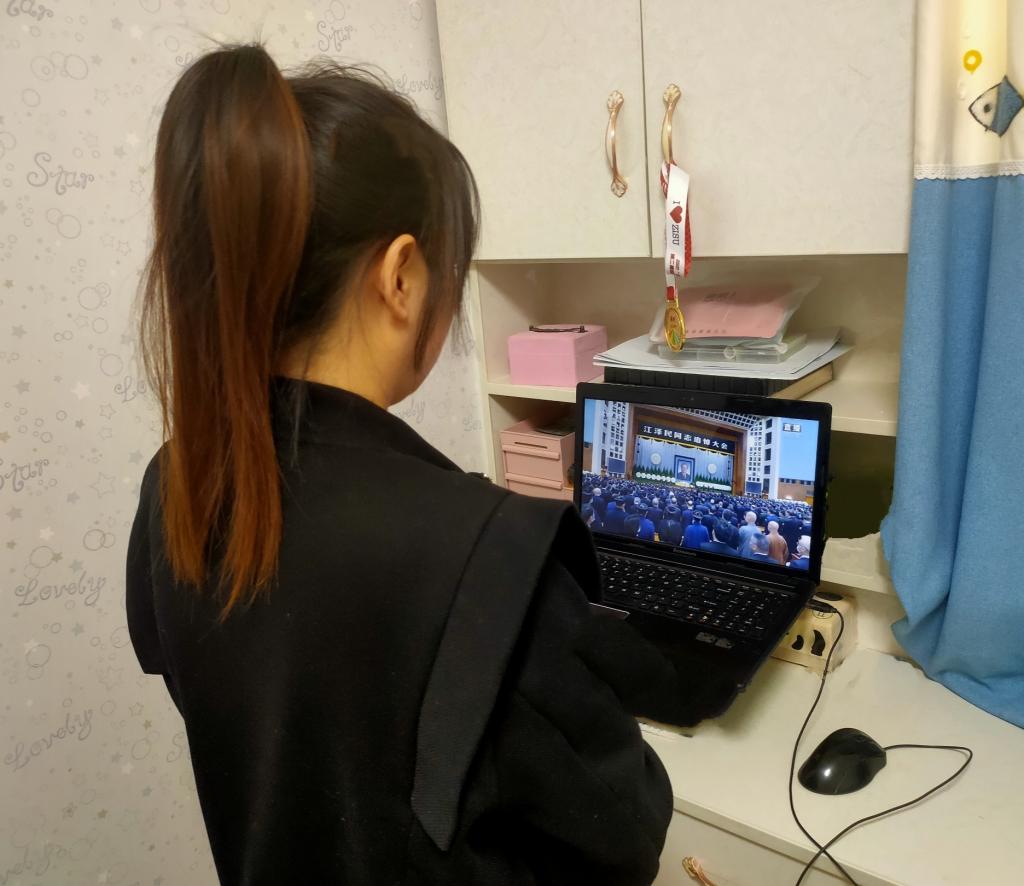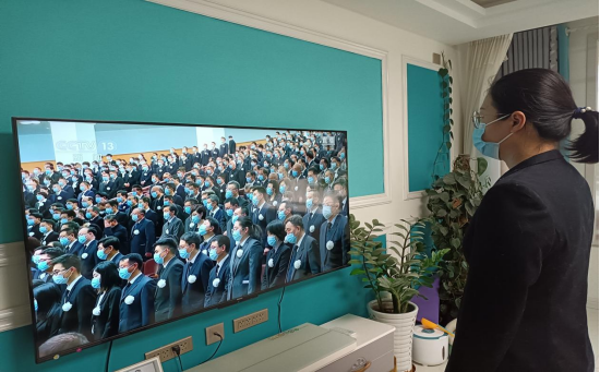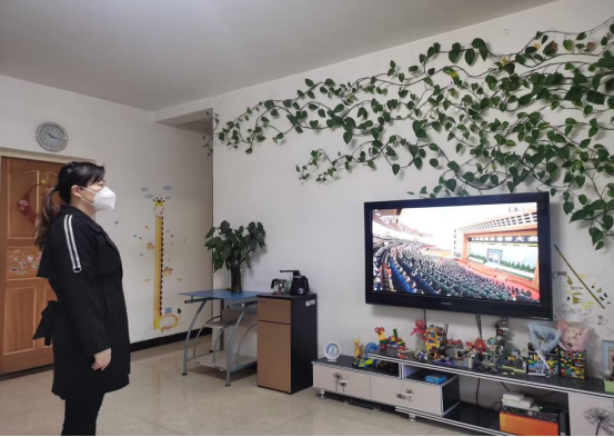 2022年12月6日上午,胡杨学院教工党支部党员邹春梅在22号教工楼收看追悼大会现场直播。