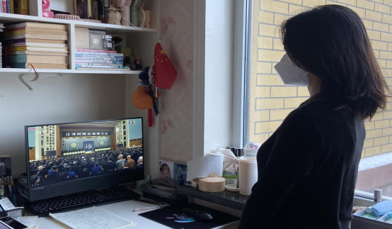 2022年12月6日上午,生科院教师胡超越在23号教工楼收看追悼大会现场直播。