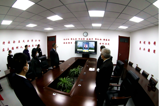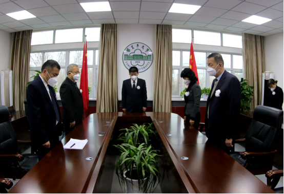 2022年12月6日上午,党委书记赵光辉,党委副书记、校长张爱萍,党委常委、副校长曲义勇、于军、石长青在行政楼308会议室收看追悼大会现场直播。