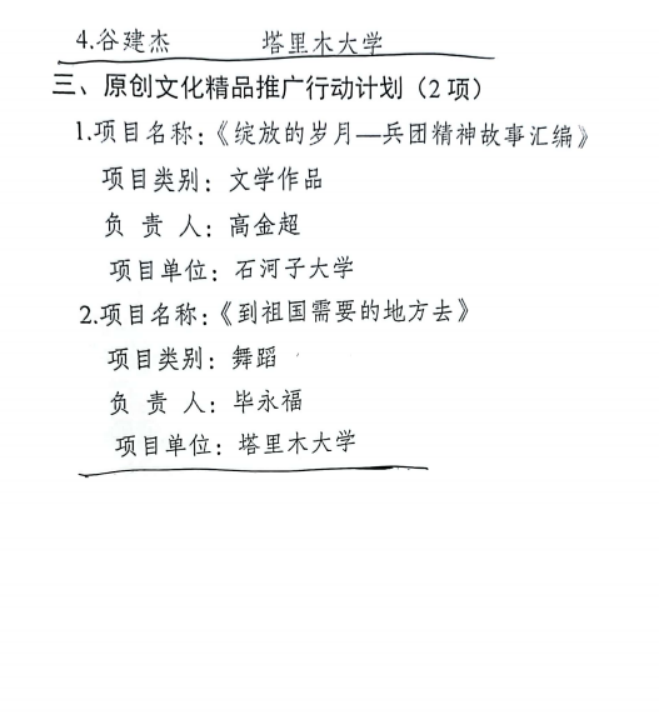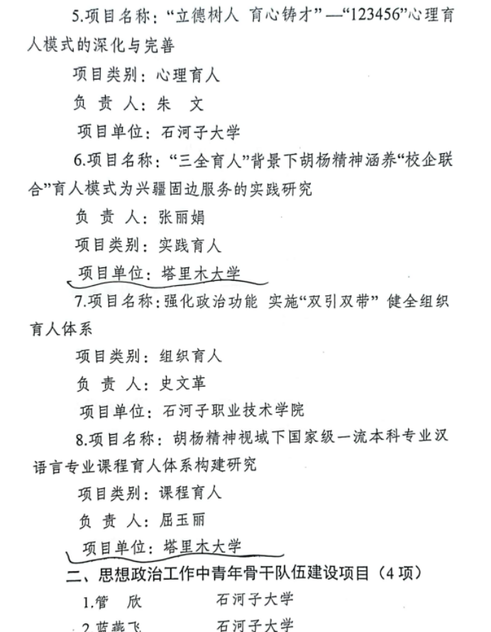 在思想政治工作精品项目中,beat365张爱萍教授的实践育人项目《胡杨精神育人体系的构建与实践》,张丽娟副教授的实践育人项目《“三全育人”背景下胡杨精神涵养“校企联合”育人模式为兴疆固边服务的实践研究》,屈玉丽教授的课程育人项目《胡杨精神视域下国家级一流本科专业汉语言专业课程育人体系构建研究》;谷建杰副教授获得思想政治工作中青年骨干队伍建设项目;舞蹈《到祖国需要的地方去》获得原创文化精品推广行动计划。