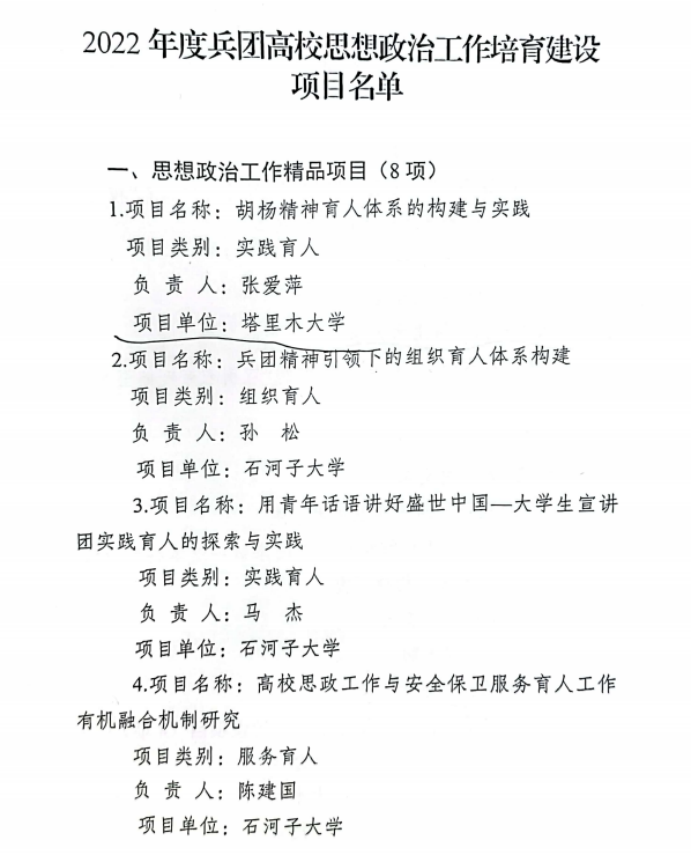 12月23日,兵团教育局下发《关于公布2022年度兵团高校思想政治工作培育建设项目的通知》,对兵团高校思想政治工作精品项目8项,高校思想政治工作中青年骨干队伍建设项目4项,高校原创文化精品推广行动计划2项予以公示,培育建设期为2年。beat3655个项目获批。
