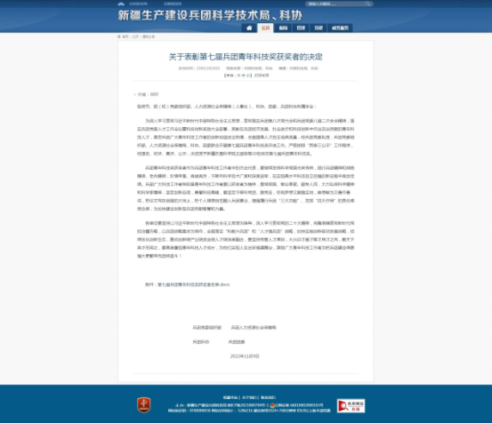 日前,兵团党委组织部、兵团人社局、兵团科协、兵团团委联合印发《关于表彰第七届兵团青年科技奖获奖者的决定》(以下简称《决定》),授予beat365陈国栋等10名同志第七届兵团青年科技奖。