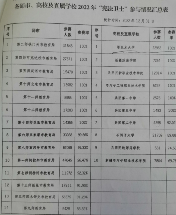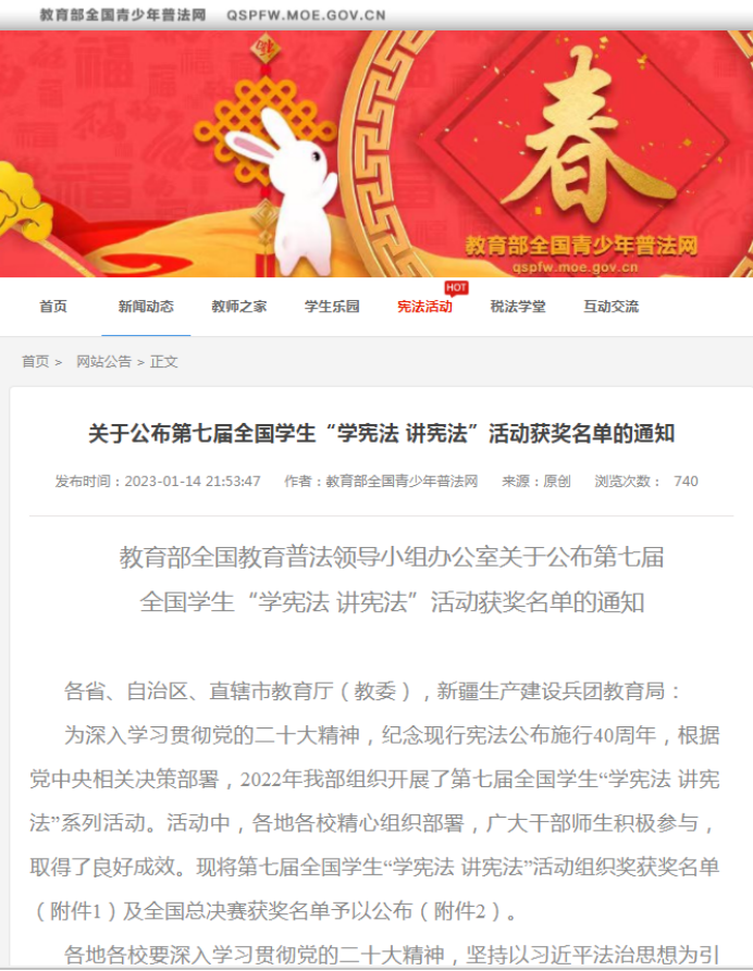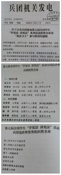 1月14日,教育部全国青少年普法网发布了《关于公布第七届全国学生“学宪法 讲宪法”活动获奖名单的通知》。兵团教育局于17日下发《关于公布兵团参加第七届全国学生“学宪法 讲宪法”系列活动获奖名单及“宪法卫士”参与情况的通报》。