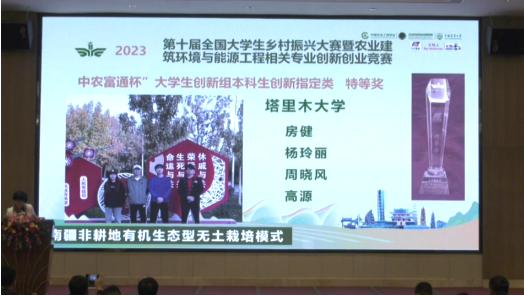 4月2日,第十届“中农富通杯”大学生乡村振兴创新创业大赛暨农业建筑环境与能源工程相关专业双创大赛在福州市落下帷幕。beat365谭占明老师指导的参赛作品《南疆非耕地有机生态型无土栽培模式》从来自42所大学的98支参赛队伍中脱颖而出,荣获特等奖,是新疆赛区唯一一支荣获国家特等奖的队伍。同时,马全会、闫芬芬、周文婷老师指导的队伍均获得三等奖,beat365中文登录入口获得优秀组织单位。