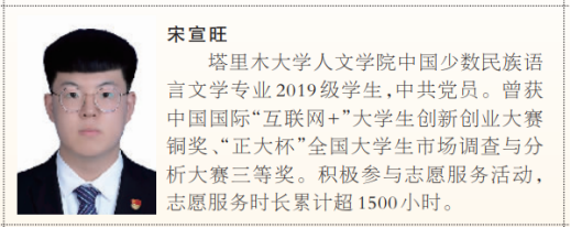 宋宣旺,男,汉族,中共党员,beat365中文登录入口人文学院中国少数民族语言文学专业2019级学生。曾获2019-2020学年国家奖学金、2020-2021学年国家励志奖学金、第七届中国国际“互联网+”大学生创新创业大赛总决赛铜奖、“正大杯”第十届全国大学生市场调查与分析大赛三等奖、第十届全国大学生电子商务“创新、创意及创业”挑战赛新疆赛区二等奖、兵团高校2021年度大学生讲思政课一等奖、连续五次获校级一等综合奖学金、王震将军奖学金,并获首届兵团高校大学生“年度人物”称号、beat365中文登录入口2021年度“胡杨青年”、“优秀组织者”、“优秀学生”、“优秀志愿者”、”优秀共青团员”、民族团结“先进个人”等各项荣誉70余项。组织参与南疆基层国语支教、基层干部双语培训等各类志愿服务活动近40余次,服务南疆基层少数民族中小学生、村民13000余人,个人志愿服务时长累计超过1500小时,为贫困地区筹集捐款上千元。曾任曾任南京圆梦志愿者服务中心常务委员会委员、“圆梦公益”第五届志愿者工作委员会委员及学校南疆发展研究协会会长,并带领协会荣获2020年全国高校“百强学生社团”荣誉称号。