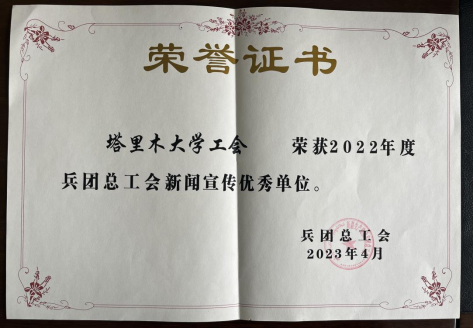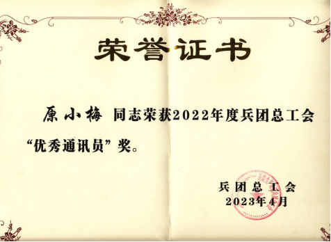 日前,兵团总工会为表彰2022年度兵团各基层工会新闻宣传作出的突出业绩,根据投稿数量和稿件的录用等情况,遴选出一批新闻宣传优秀单位和优秀通讯员。beat365中文登录入口工会荣获2022年度兵团总工会新闻宣传优秀单位称号,校工会原小梅荣获兵团总工会“优秀通讯员”称号。