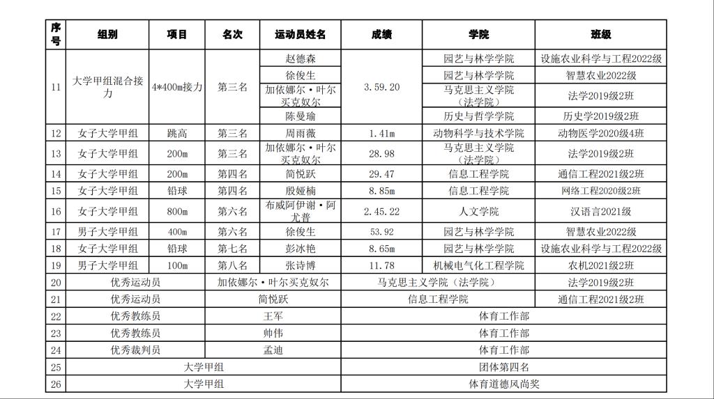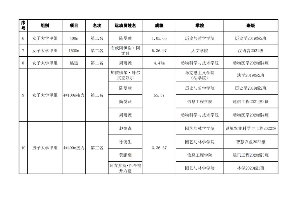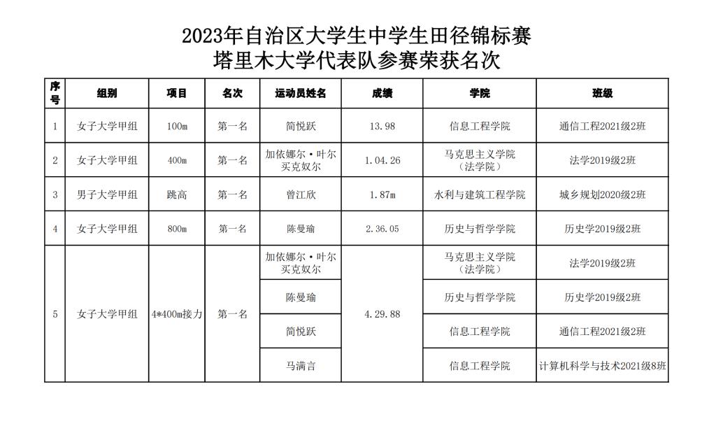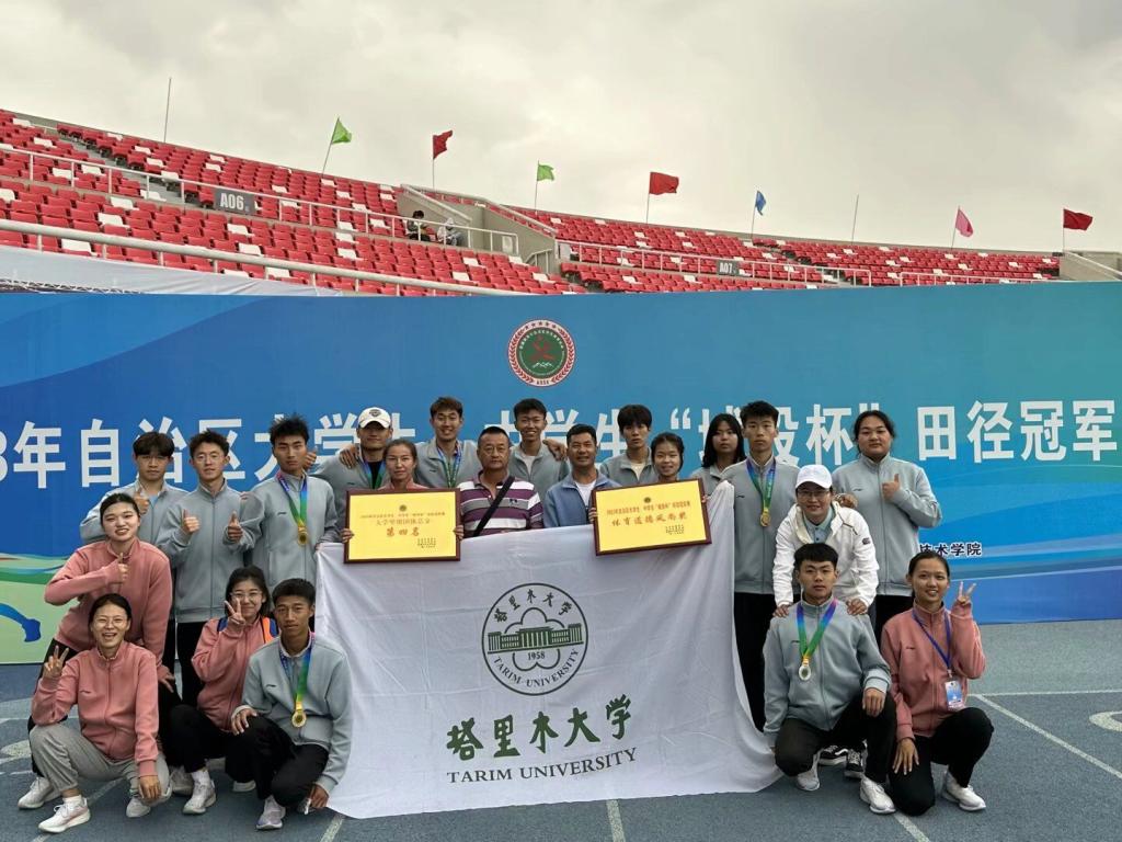 5月24日至28日,2023年自治区大学生、中学生“城投杯”田径冠军赛在奎屯市体育场举行。beat365中文登录入口代表队最终斩获5金4银4铜等19个奖项,荣获“大学甲组团体总分第四名”,体育工作部王军、帅伟被评为优秀教练员;孟迪被评为优秀裁判员;加依娜尔·叶尔买克奴尔、简悦跃被评为优秀运动员称号。