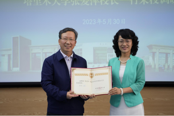 座谈过程中,王启龙为张爱萍颁发西安外国语大学客座教授聘书。
