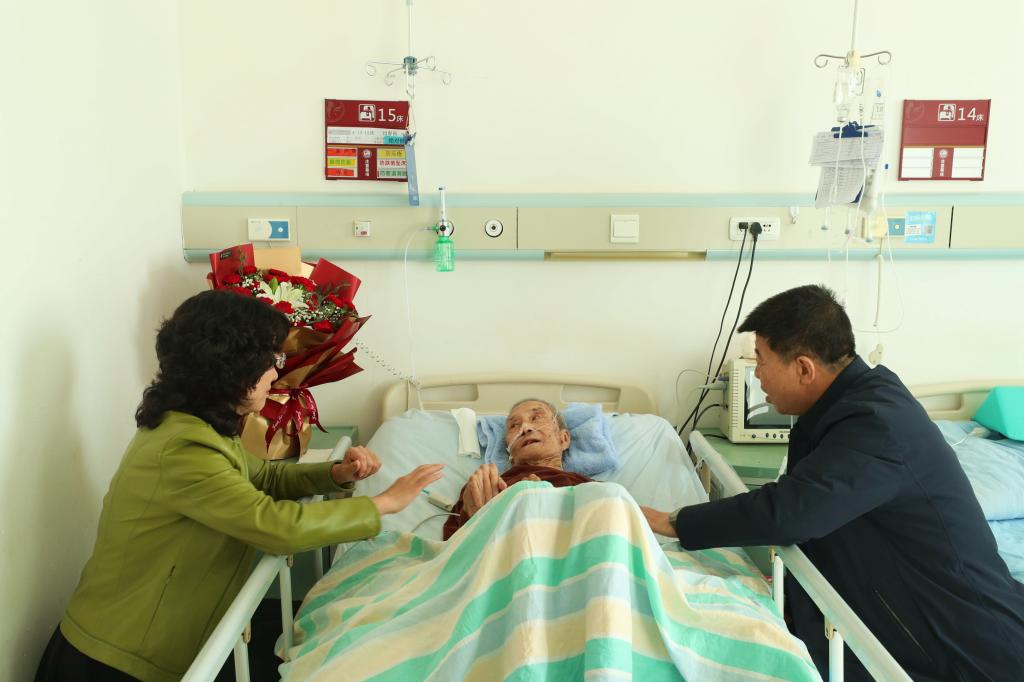 11月13日上午,党委书记赵光辉,党委副书记、校长张爱萍来到第一师阿拉尔医院看望慰问退休专家教授闫春雨。