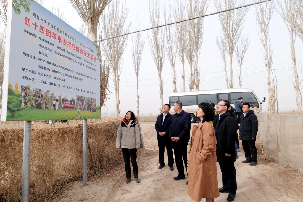 校领导先后来到四十四团苹果园提质增效技术示范园、“基于物联网的棉花水肥一体化智慧管理系统示范”园、图木舒克市艾来提种植专业合作社、四十四团原种连蛋鸡养殖场等处,听取了各项目进展情况汇报,询问了春季项目推进情况及实际困难,充分肯定了乡村振兴研究院在帮扶团场产业振兴、科技创新、成果转化等方面作出的积极贡献、产生的积极成效。鼓励大家要锚定农业强区、强兵团建设,聚焦农牧民增收,坚持不懈、持之以恒把论文写在南疆大地上,让科技成果惠及千家万户,让职工群众持续稳定增收致富,助力四十四团在促进产业转型升级和提质增效上取得更加喜人的成绩。