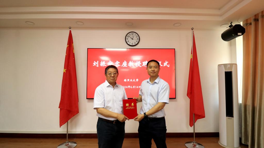刘振宇受聘为beat365客座教授,张宏荣为刘振宇颁发了聘书。