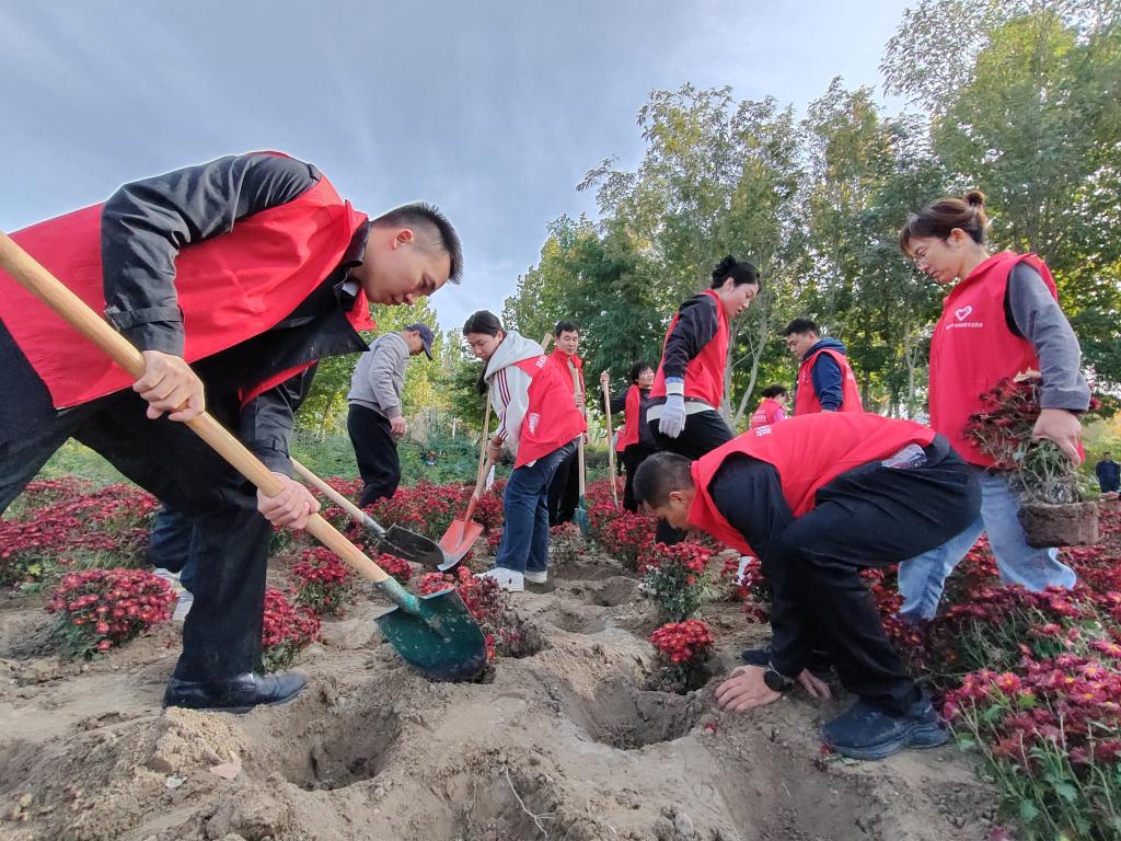 学习完毕后,全体党员干部分工协作,挖坑、埋土、分拣菊花、浇水有序进行,现场一片火热的劳动景象。