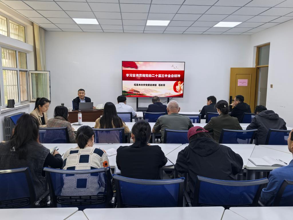 10月16日下午,党委副书记、副校长石长青在行政楼219会议室为机关党委第三党支部全体党员干部上专题党课,宣讲党的二十届三中全会精神。