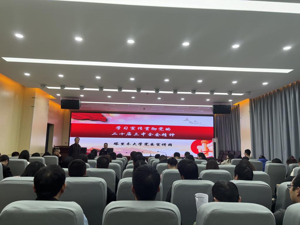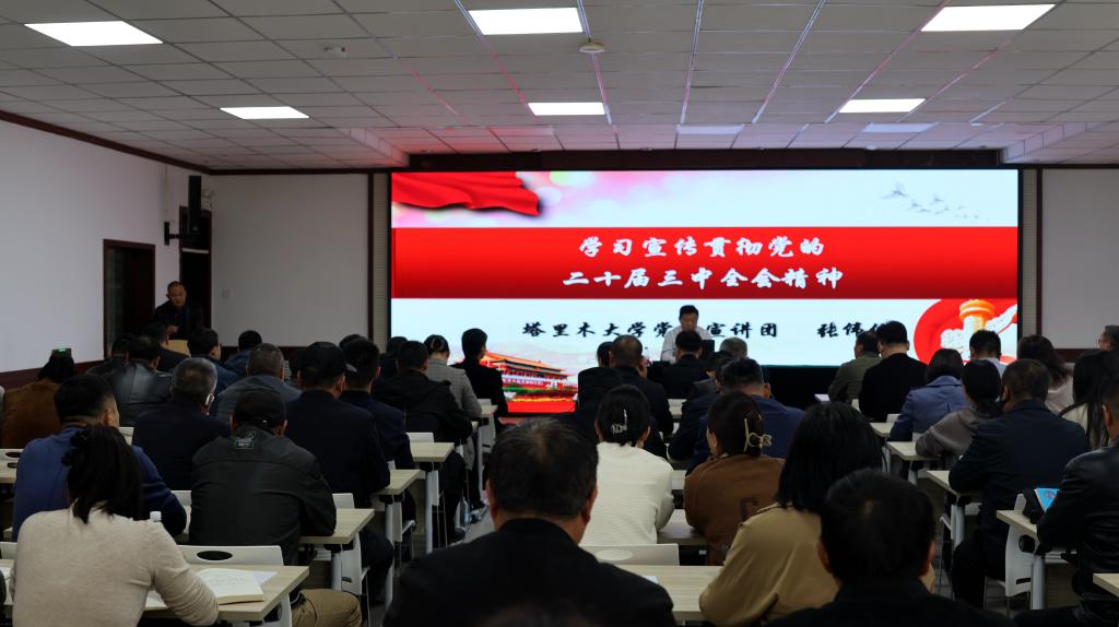 按照学校党委统一部署,10月23日下午,党委副书记于军深入农学院宣讲党的二十届三中全会精神;党委常委、副校长汤智辉深入机械电气化工程学院、纺织服装学院宣讲党的二十届三中全会精神;党委常委、副校长居来提·司马义深入化学化工学院宣讲党的二十届三中全会精神;党委常委、副校长万传星深入生命科学与技术学院宣讲党的二十届三中全会精神;党委常委、副校长张宏荣深入园艺与林学学院宣讲党的二十届三中全会精神;党委常委、副校长谢建新深入医学院宣讲党的二十届三中全会精神;党委常委、组织部部长张伟信深入机关党委、胡杨学院党总支宣讲党的二十届三中全会精神。