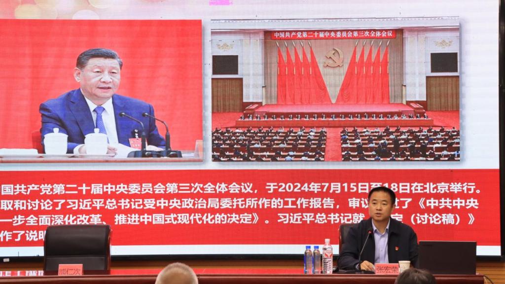 校领导主要从深刻把握党的二十届三中全会的主题及重大意义、深入学习领会习近平总书记在党的二十届三中全会上的重要讲话精神、深刻把握进一步全面深化改革的重大举措,牢记嘱托、感恩奋进,推动全会精神在学校落地落实等方面,结合工作实际和学习体会,对党的二十届三中全会精神进行了全面深入解读。要求广大党员干部、师生员工切实把思想和行动统一到全会战略部署上来,把智慧和力量凝聚到落实全会提出的各项目标任务上来,统筹推进教育科技人才体制机制一体改革,为加快推进兵团特点南疆特色一流大学,推进中国式现代化兵团实践作出积极贡献。
