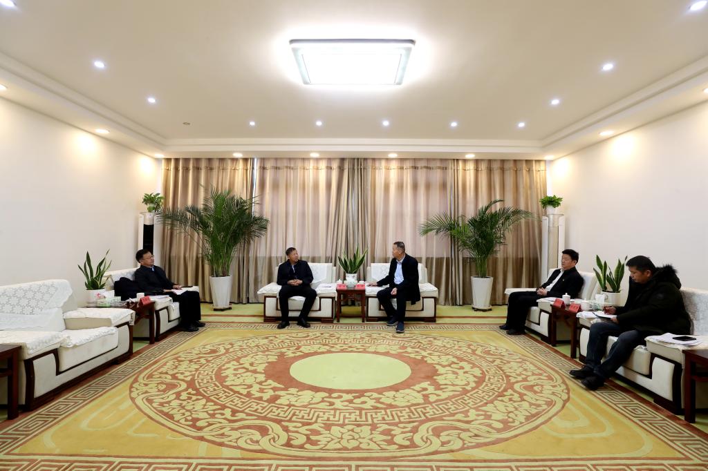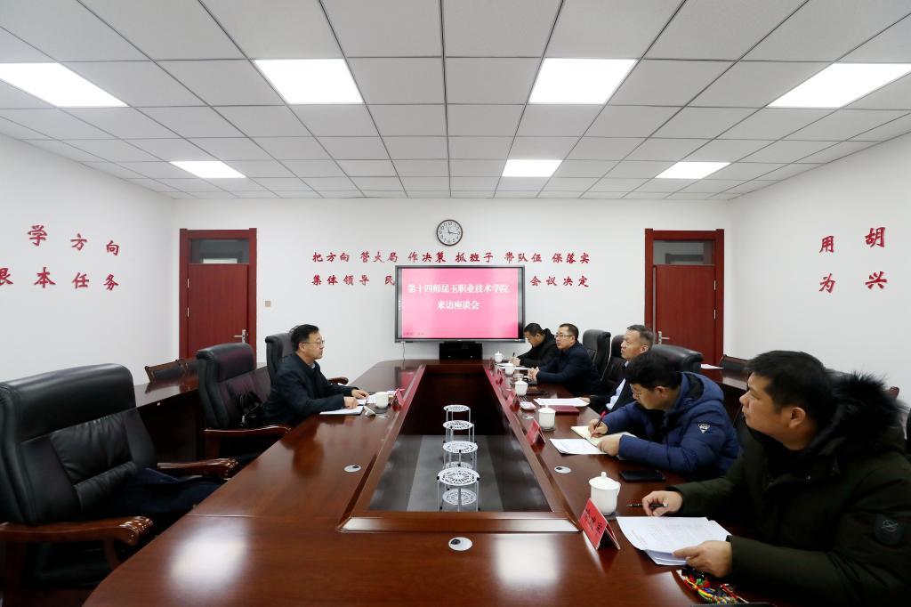 1月11日下午,第十四师昆玉市党委常委、副政委、组织部部长颜俊,昆玉职业技术学院副书记、院长冯保生一行来校交流,与beat365党委副书记于军,党委常委、组织部部长张伟信等领导在行政楼四号洽谈室进行深入交流。