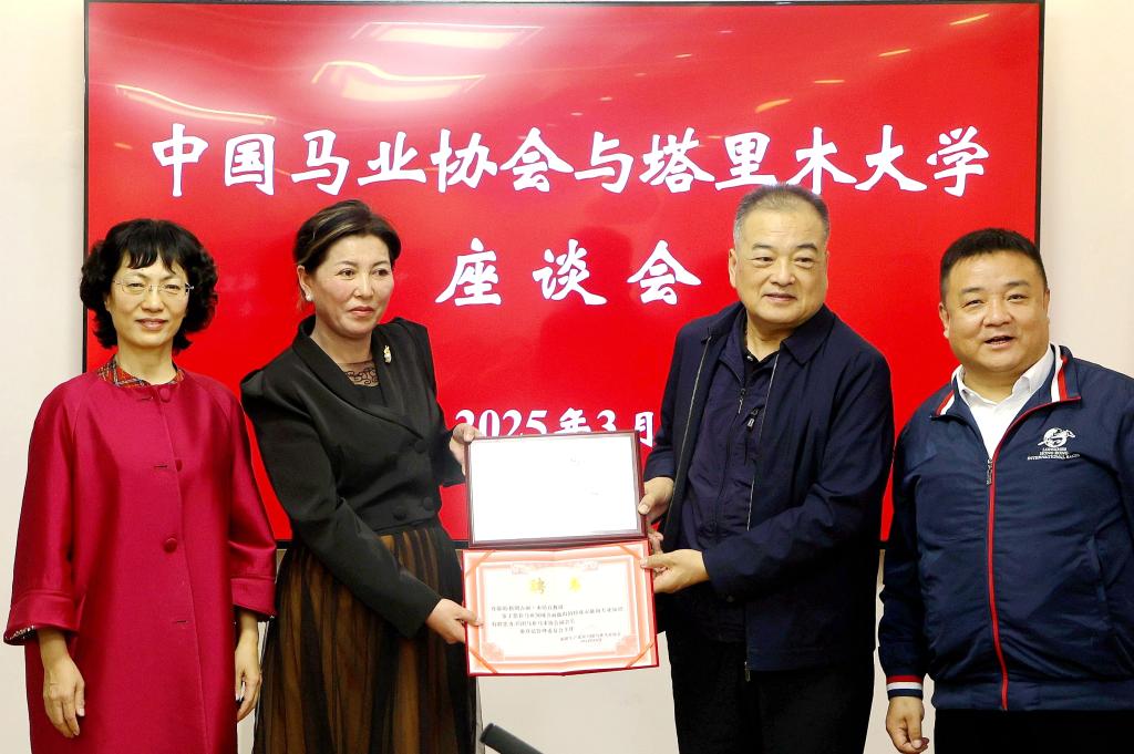 beat365中文登录入口格明古丽·木哈台教授受聘为兵团马业马术协会副会长兼登记管理委员会主任,张军社为格明古丽·木哈台教授颁发了聘书。