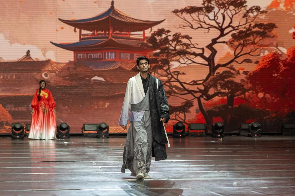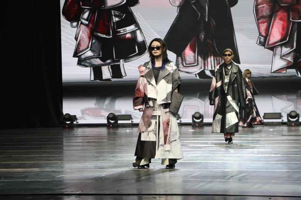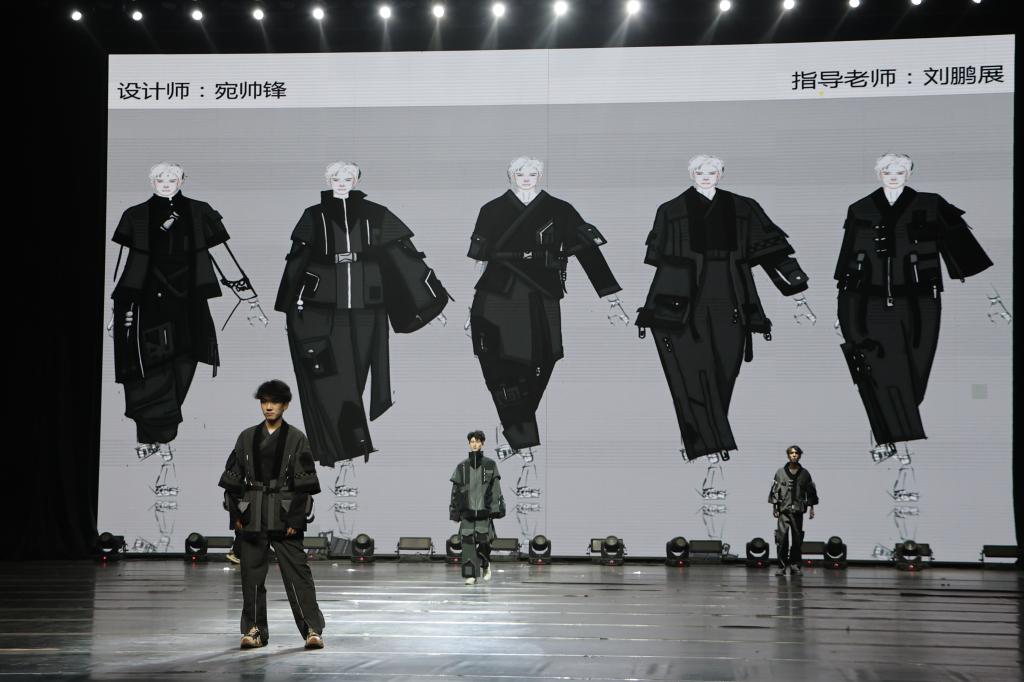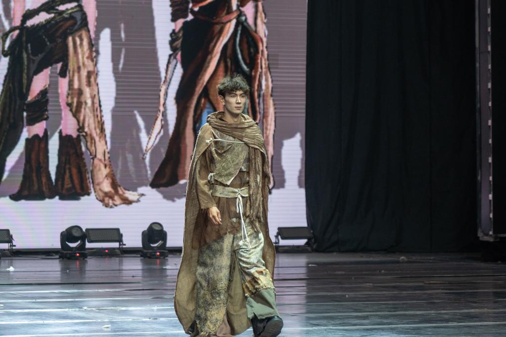 《废土新生·逆世锋芒》系列作品,突破性使用做旧牛仔、工业网布,搭配机能风口袋与链条,展现出坚韧之美;《星际领航·未来视界》系列作品,运用科技感的面料与几何切割,展现高科技感与奇幻色彩,引领观众探索未来;《华服新韵·国际风采》系列作品,以国际学生身着中式元素服装为代表,展现出传统服饰的别样魅力。