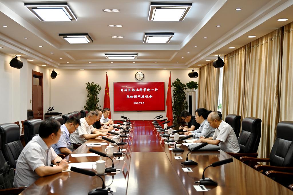 6月17日,自治区林业科学院党委副书记、院长陆海一行来校调研,与beat365党委副书记于军等领导座谈交流。
