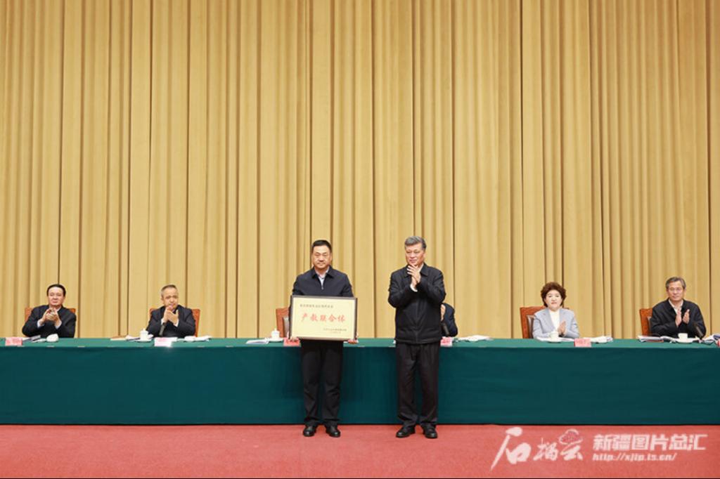12月17日,自治区党委书记、兵团党委第一书记、第一政委马兴瑞为新疆首个国家级市域产教联合体——昌吉国家农高区现代农业产教联合体授牌。天山网-新疆日报记者 崔志坚摄