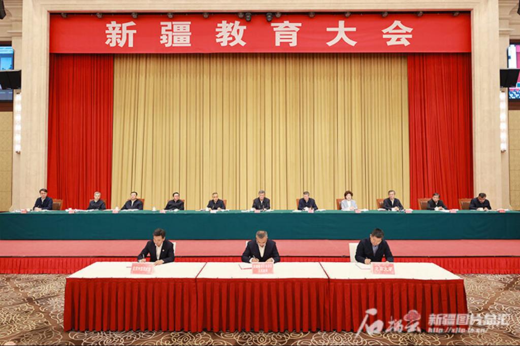 自治区人民政府与北京大学、北京中医药大学签署战略合作协议,自治区有关地州市和单位与国内高校签署共建研究院战略合作框架协议,兵地教育部门与19个援疆省市教育部门签署持续深入推进教育援疆战略合作框架协议。