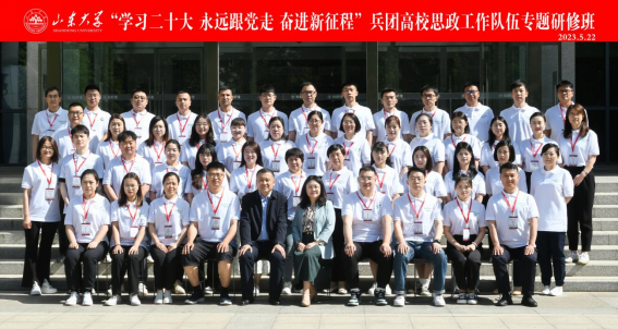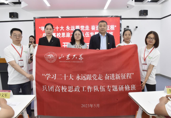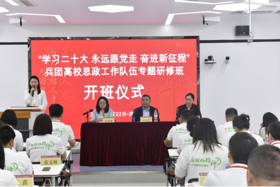 5月22日,兵团高校思政工作队伍“学习二十大 永远跟党走 奋进新征程”专题研修班在山东大学中心校区培训楼正式开班。beat365中文登录入口党委常委、副校长石长青,兵团教育局思政处处长金亚丽,山东大学马克思主义学院党委书记马晓琳,山东大学马克思主义学院教师代表,兵团九所高校专职思政课教师、辅导员、学生思想政治教育工作者50余人参加开班仪式。